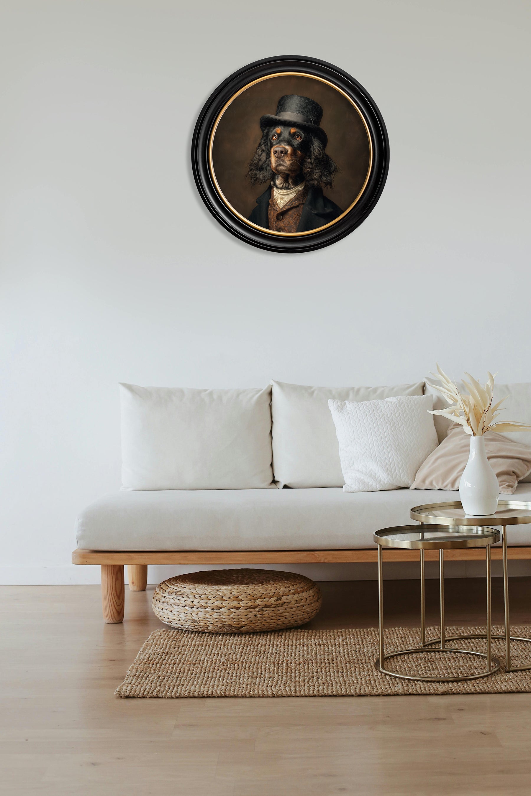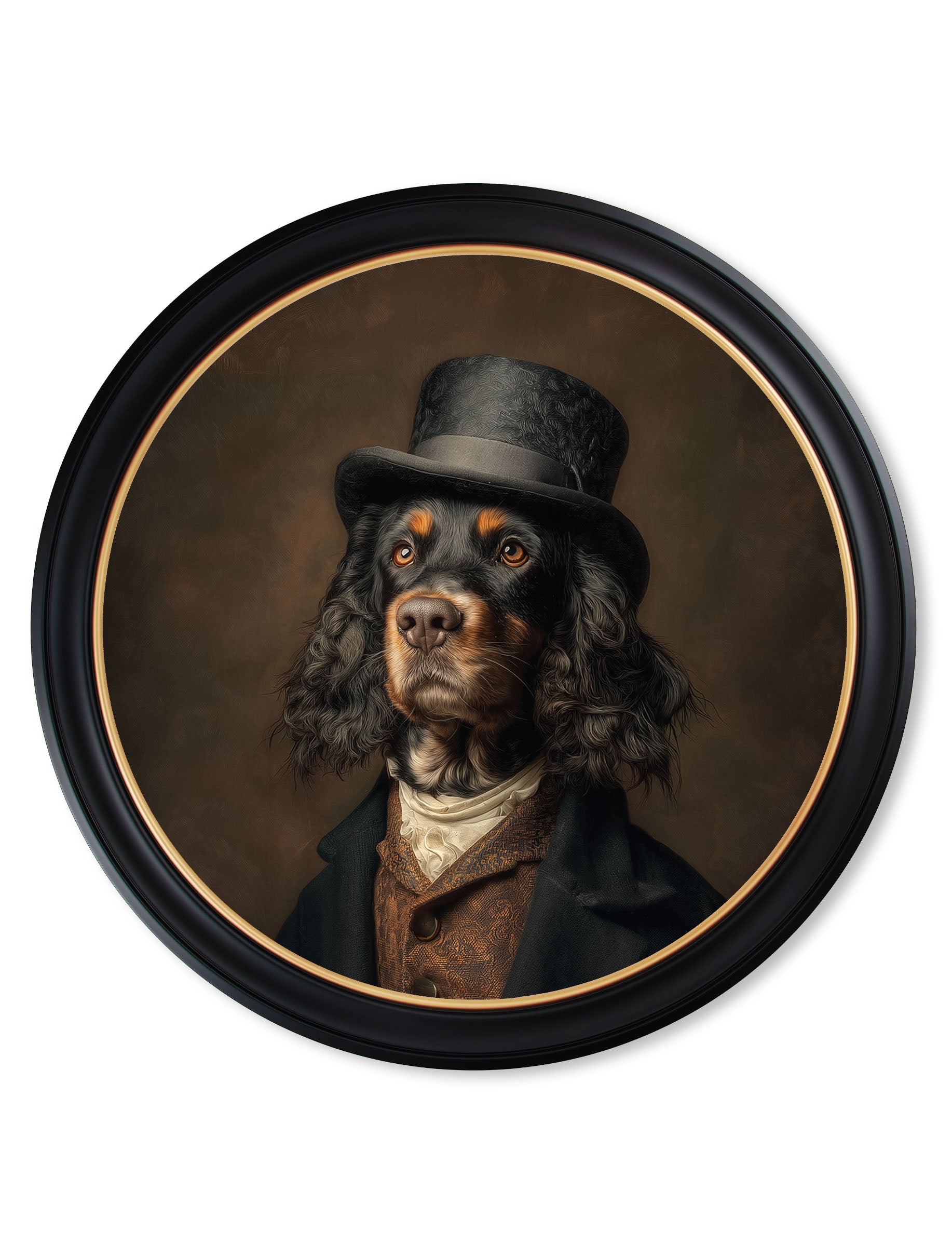 Duke Gordy of Tails is a distinguished Gordon Setter who exudes noble elegance. Dressed in a refined black jacket, a patterned amber waistcoat paired with a cream cravat and crowned with a classic black top hat. He sits with pride against a rich muddy brown backdrop, presented in our Oxford Black and Gold frame.